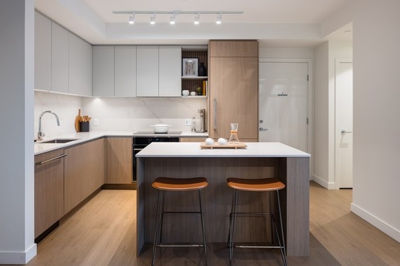 Units’ kitchen countertops are concrete-look quartz complemented with marble-look porcelain backsplashes, continuing a theme of simple and neutral finishes. Photo by Jonathan Folk