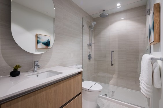 In the units’ bathrooms, the vanities reflect the selected colour scheme with white quartz countertops and backsplashes and 12-by-24-inch porcelain floor tiles. Photo by Jonathan Folk