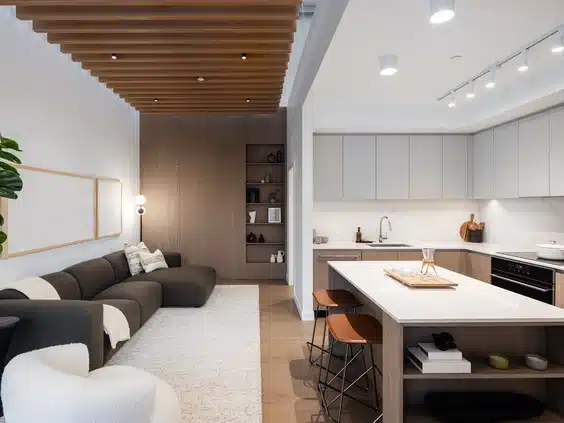 Units’ kitchen countertops are concrete-look quartz complemented with marble-look porcelain backsplashes, continuing a theme of simple and neutral finishes. Photo by Jonathan Folk