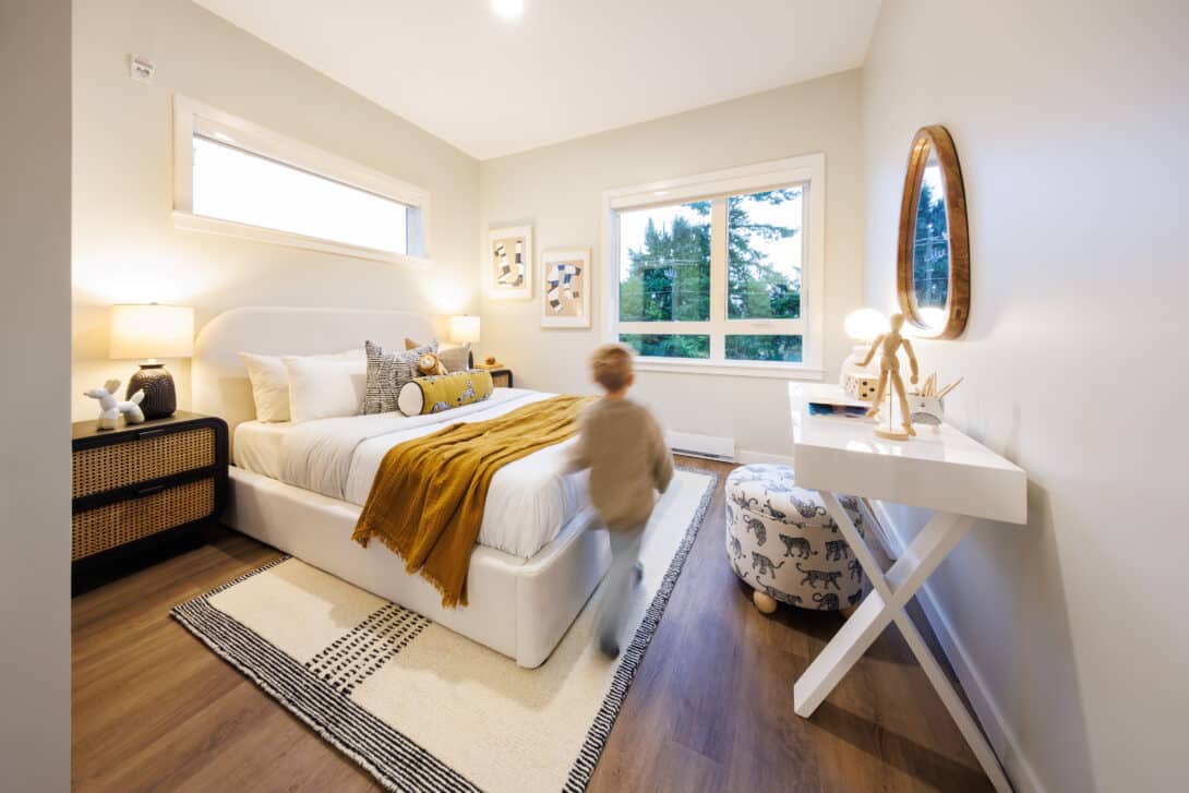 There’s also onsite parkade for residents with bike storage, a common living space with open-plan kitchen suitable for community meals and an adjacent kitted-0ut playroom. There’s also a robust outdoor play area with green spaces with edible plants including raspberry canes and blueberries, as well as rosemary, with the intention that families can eat the harvests.